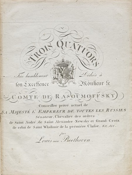 Титульна сторінка Трьох струнних квартетів № 7, 8 і 9 («Квартети Розумовського») Людвіга ван Бетховена. 1808 р. Зібрання Будинку Бетховена у Бонні
