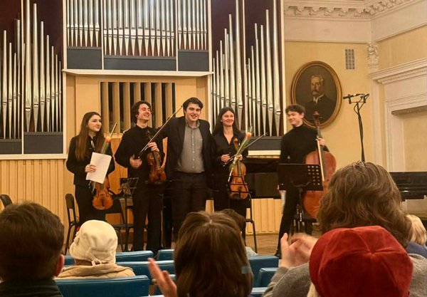 На головному фото Богдан Вакуленко (в центрі) із виконавцями його твору для струнного квартету