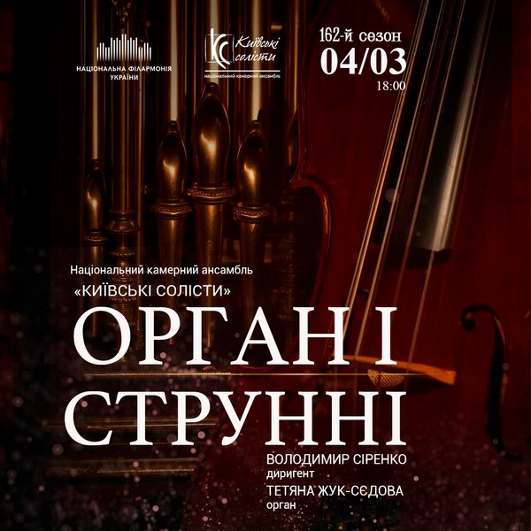 4 березня – концертна програма ОРГАН І СТРУННІ об’єднує шедеври європейської музики XVII–ХХ століть у художньому діалозі між епохами, стилями та духовними смислами, в центрі якого – орган і струнний ансамбль.
