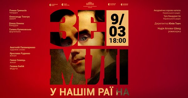 9 березня – поетично-музичне дійство У НАШІМ РАЇ НА ЗЕМЛІ… Це подорож у часі та просторі, де слово стає музикою, а тиша говорить голосніше за звук. Старовинне автентичне вбрання, українська народна пісня, класичний вокал, дві бандури й маримба та сила Шевченкового слова зіллються в єдину дію, де сучасне і минуле – поруч. Слухачі почують як класичні хорові полотна Кирила Стеценка та Якова Степового, так і твори сучасних композиторів – Євгена Станковича, Михайла Шведа. Програму вибудувано як діалог поколінь: від величного «Реве та стогне» до камерних солоспівів у супроводі бандур і маримби. Академічним хором імені Платона Майбороди Українського радіо диригуватиме Юлія Ткач, яка цьогоріч потрапила до короткого списку в конкурсі на здобуття Національної премії України імені Тараса Шевченка у номінації «Концертно-виконавське мистецтво».