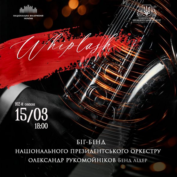 15 березня – WHIPLASH. Біг-бенд Національного президентського оркестру представляє програму, що розкриває джаз у всій його багатогранності. В центрі уваги – твори, що стали іспитом на майстерність для багатьох поколінь виконавців.