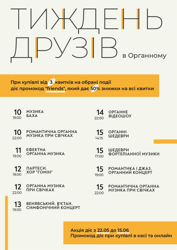Команда Органного щиро вірить: найкращі враження народжуються у колі людей, з якими легко мовчати, сміятися і слухати музику. Саме тому ми оголошуємо Тиждень друзів, який уже став гарною традицією в нашому залі.